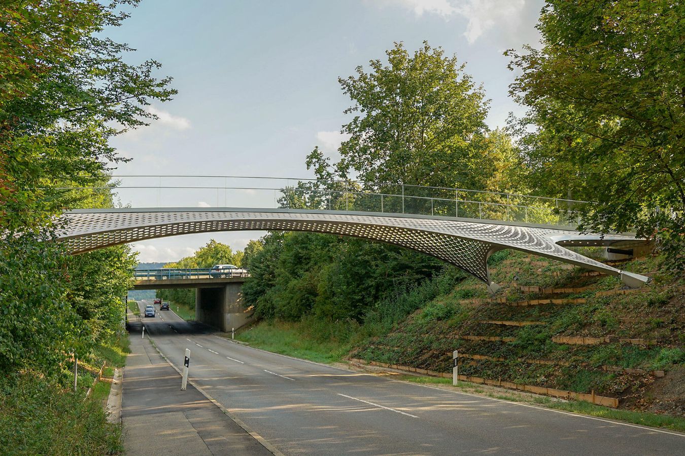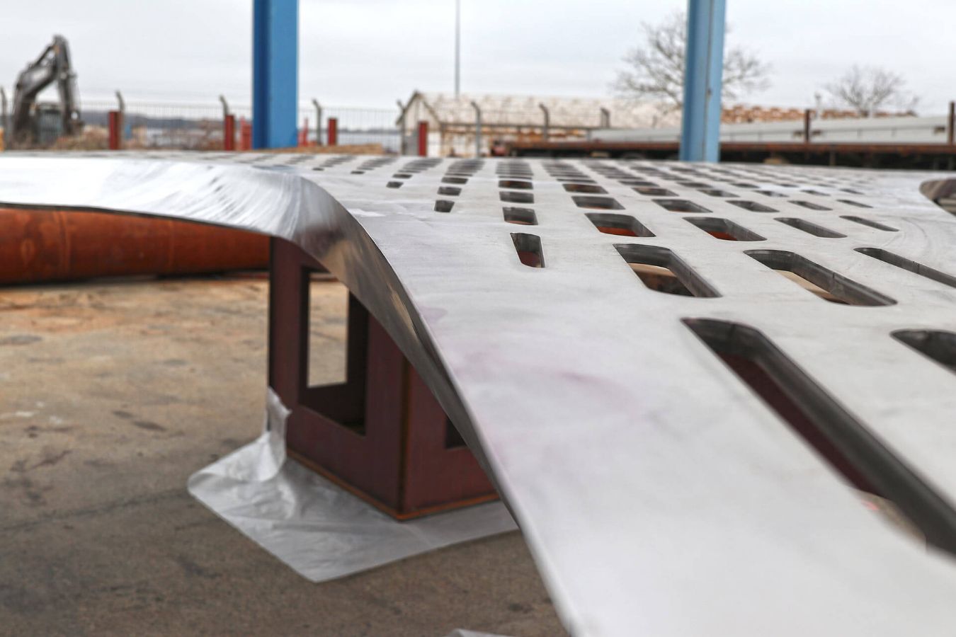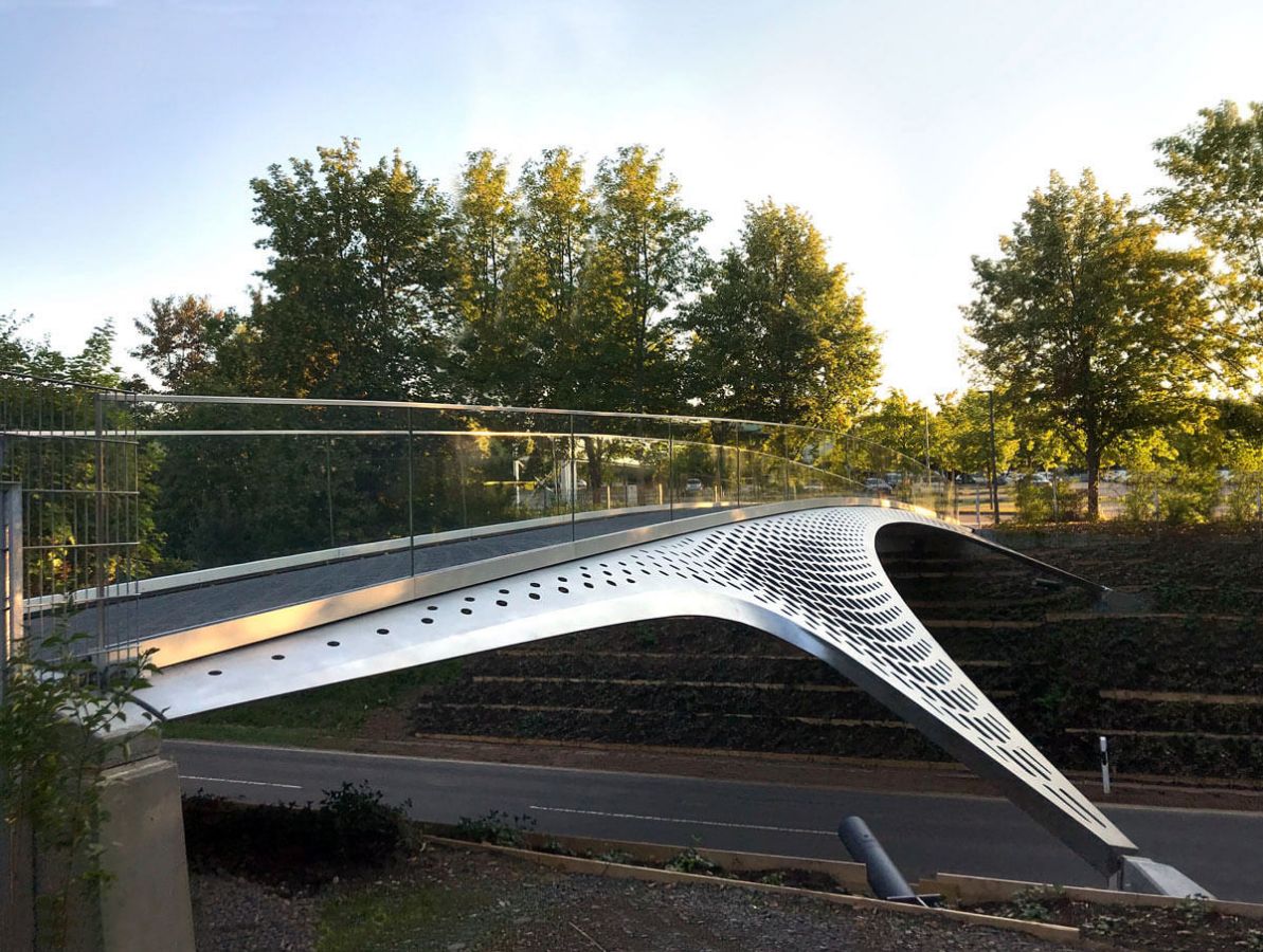 Die Fußgängerbrücke führt über eine stark befahrene Straße und verbindet zwei Betriebsstandorte am TRUMPF Hauptsitz. Eingesetzt wurde Hochfester, dünner und korrosionsbeständiger Edelstahl, zugeschnitten mit TRUMPF Lasertechnologie. Die Edelstahlplatten wurden bei Ostseestaal mittels unserer Pressen in die benötigte Form gebracht und in der Schweißmontage vormontiert.
