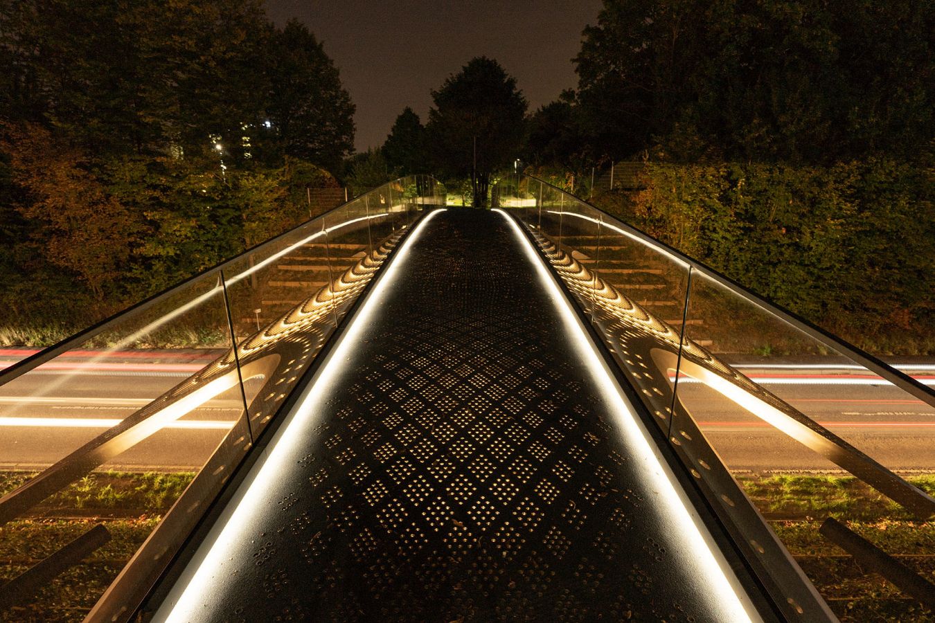Die 28 Meter lange Brücke besteht aus einer leichten Schalenkonstruktion und nur 2cm dünnen, doppelt gekrümmten Edelstahlblechen. Umformung und Schweißmontage wurden komplett durch Ostseestaal realisiert. Die Brücke steht jetzt auf dem Trumpf Firmengelände bei Stuttgart.